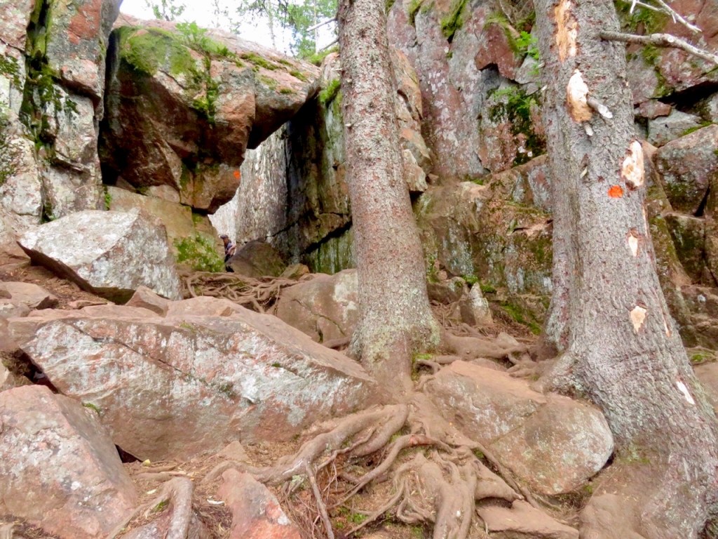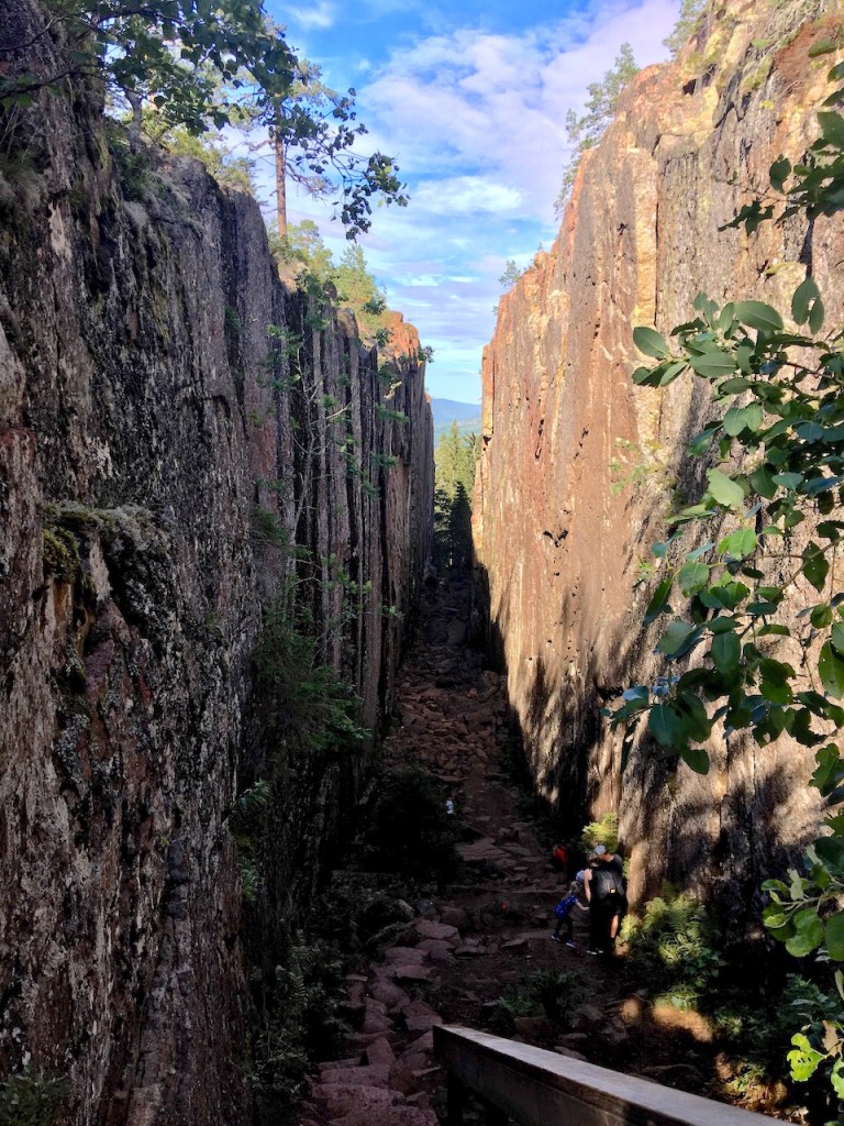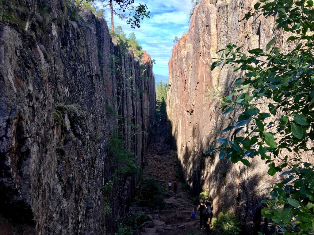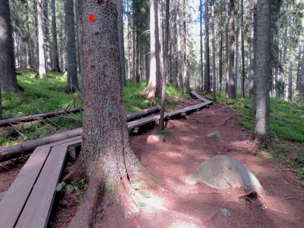 Da wir einfach nur ein paar Kilometer laufen wollen nach der vielen Sitzerei im Auto und keine große Wanderung unternehmen möchten, entscheiden wir uns für die „nur“ 8km (Hin- und Rückweg) lange Tour zur Felsenschlucht, der ca. 200 Meter langen, 30 Meter tiefen und sieben Meter breiten Slåttdalskrevan. Die ersten zwei Kilometer folgen wir dabei dem über viele Holzstege verlaufenden, immer gut ausgeschilderten Pfad durch den Nadelwald, vorbei an grün bemoosten Felsen und großen Steinfeldern, die ebenfalls Überreste der letzten Eiszeit sind. Dann laufen wir einige Zeit an einem Moorgebiet entlang, bis wir den letzten, etwas steileren Abschnitt der Wanderung erreichen. Noch etwa 500 Meter führt der Weg bergauf, zum Schluss mit ziemlichem Gekraxel über große Felsstücke, bis wir den Aussichtspunkt in die Schlucht erreichen, die wirklich ein toller Anblick ist.