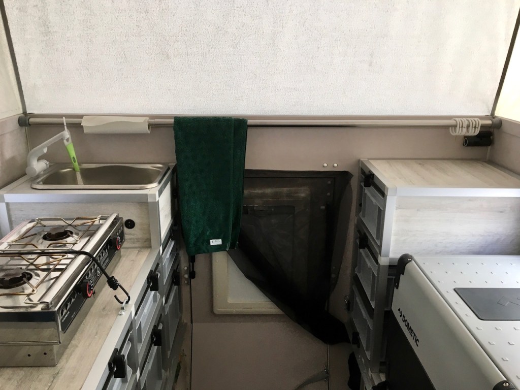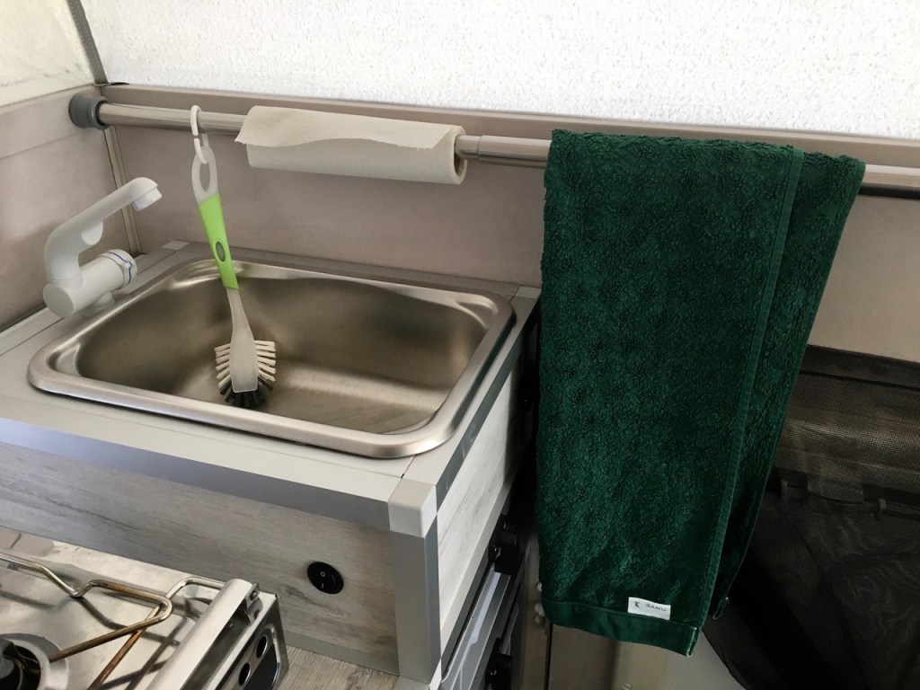 Wer meine Reiseberichte regelmäßig verfolgt weiß, dass wir unterwegs selten länger als 1-2 Nächte an einem Ort verbringen. Meistens packen wir nach dem Frühstück wieder alles zusammen und fahren weiter, weshalb es für uns oft keine Möglichkeit gibt, unsere gebrauchten, feuchten Handtücher im Freien auf der Wäscheleine trocknen zu lassen. Damit die Handtücher trotzdem trocken werden und nicht anfangen zu müffeln, haben wir oberhalb der Eingangstür in unserer Wohnkabine zwischen der rechten und linken Außenwand eine Teleskop-Duschstange installiert, auf der Handtücher während der Fahrt gut aufgehoben sind und trocknen können. Auch eine Rolle Küchenpapier und die Spülbürste – übrigens mit Hilfe von Duschvorhangringen – finden daran Platz und halten dort optimal. Ein richtig praktisches Camping Gadget!