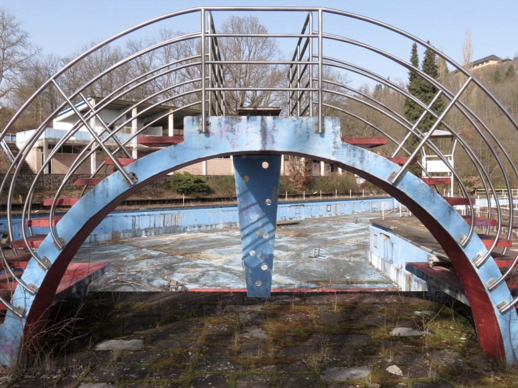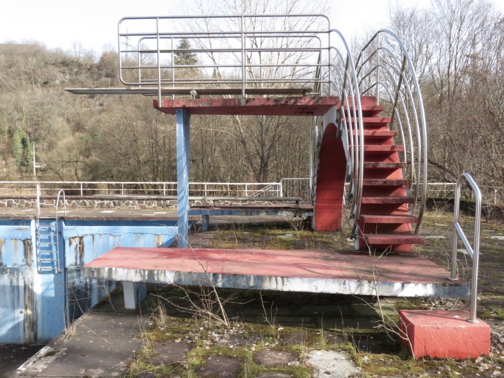 Recherchen im Anschluss an unseren Besuch haben ergeben, dass das Freibad wohl etwa im Jahr 2004 schließen musste, nachdem entschieden wurde, nur noch ein Schwimmbad in Idar-Oberstein zu betreiben. Die Wahl fiel auf ein anderes Schwimmbad in Tiefenstein, welches inzwischen als Natur-Heilbad umgebaut wurde. Das Freibad Kammerwoog verfällt seither, und Schwimmbecken, Gebäude und Einrichtung rotten vor sich hin und werden nach und nach von der Natur zurück erobert. Immer wieder faszinierend!