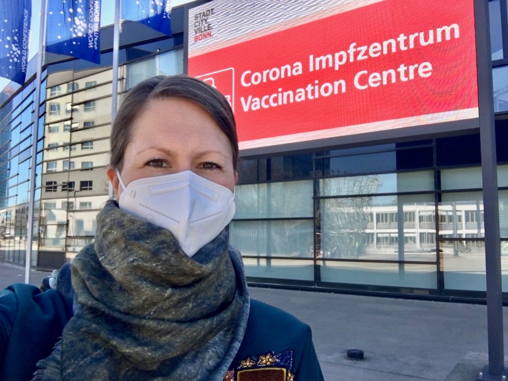 Ich stehe immer noch 2x wöchentlich im Impfzentrum. Und plötzlich heißt es: Mitarbeiter der Impfzentren sollen in die oberste Impf-Priorisierung aufsteigen! Plötzlich geht es ganz schnell, und ich erhalte meine beiden ersten Biontech-Shots innerhalb von 4 Wochen. Außerdem blühen in Bonn die japanischen Kirschbäume, und ein rosa Blütentraum durchzieht die entsprechenden Straßenzüge der Altstadt.