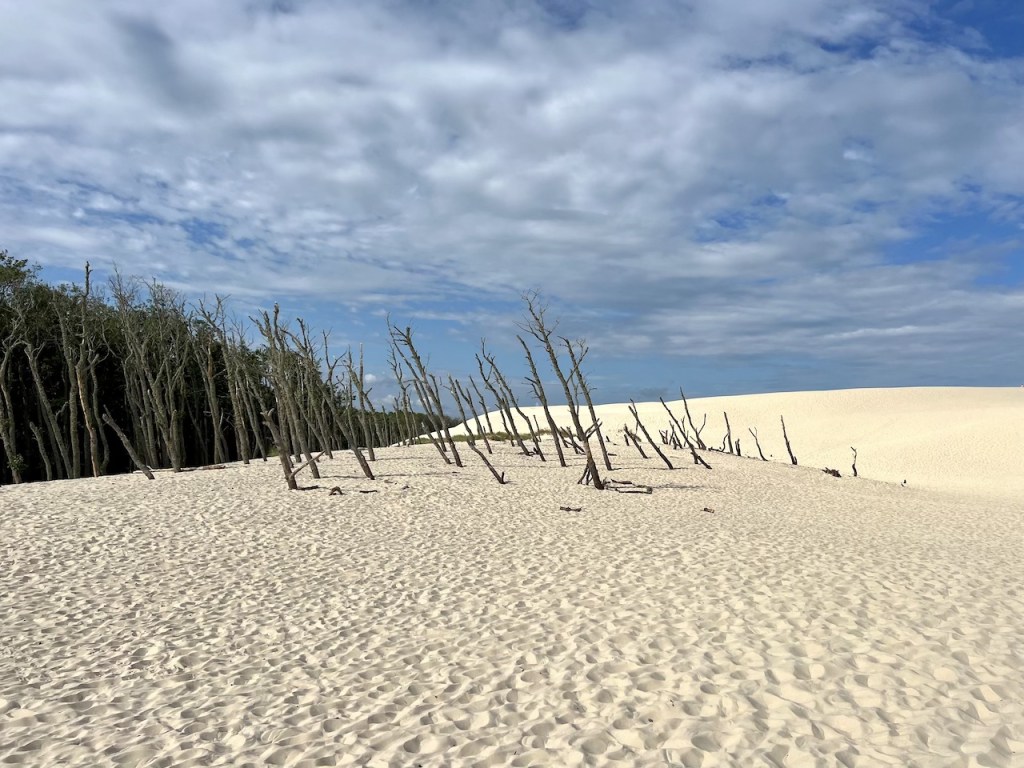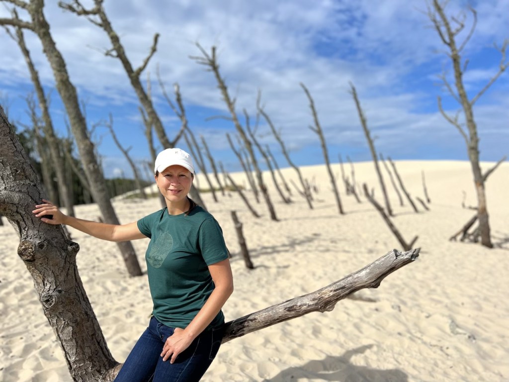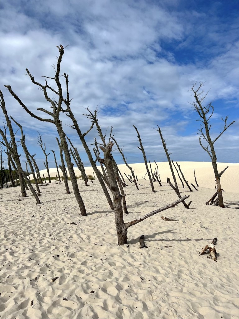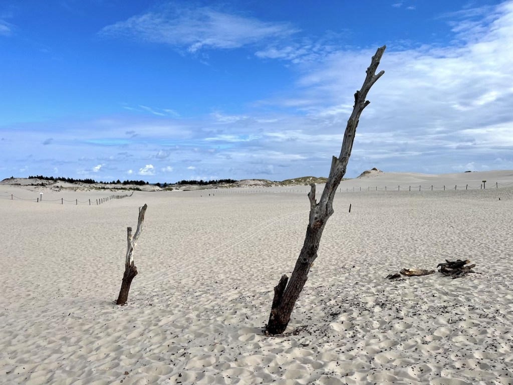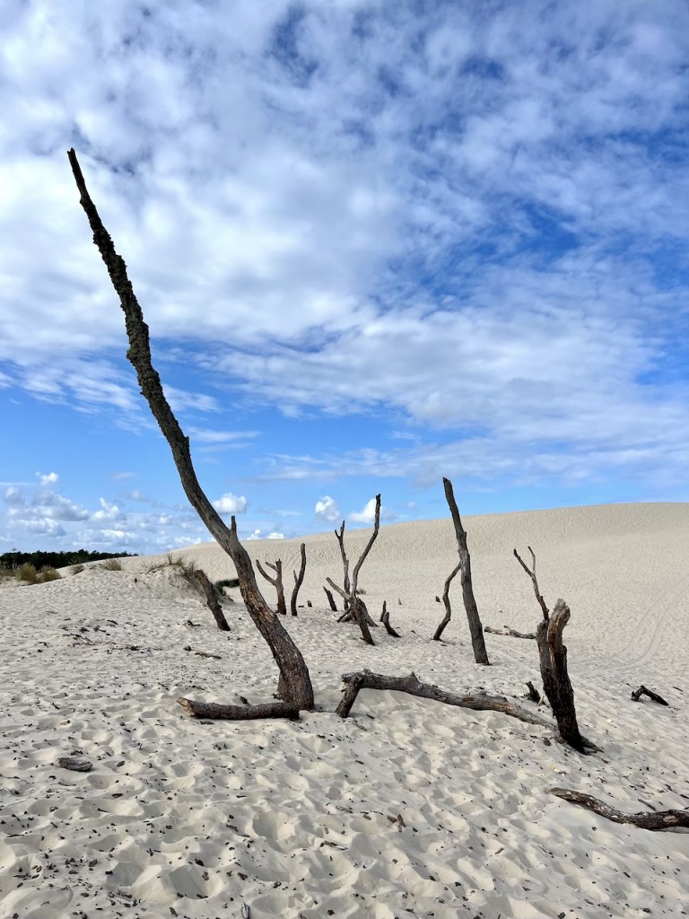 Fotografisch interessieren uns direkt die eingangs der Dünenlandschaft gelegenen bizarren, toten Baumstämme, die uns sehr an vergleichbare Bäume in Namibias Deadvlei erinnern. Überhaupt verstehen wir jetzt so richtig, weshalb diese Landschaft hier auch als Sahara Polens bezeichnet wird. Nicht nur wegen des vielen Sands, sondern auch, weil sich die Temperaturen bereits jetzt am Morgen richtig heiß anfühlen. Wir sind mit unseren Wanderschuhen, langen Jeans und T-Shirts definitiv zu warm gekleidet.