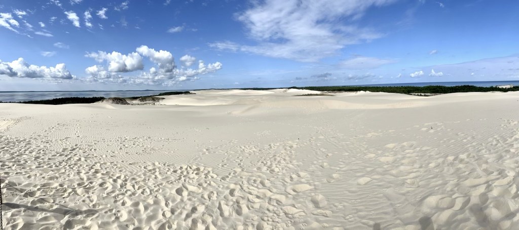 Noch ein ganzes Stück weiter kraxeln wir die Düne hinauf, die sich pro Jahr erstaunliche zwei bis zehn Meter Richtung Osten bewegt, bis zu einer Seil-Absperrung, wo man nicht weiter laufen darf. Der Nationalpark ist nämlich nicht nur Touristen-Attraktion, sondern auch Lebensraum unzähliger Vogelarten, die hier nisten, sowie Heimat vieler vom Aussterben bedrohter Pflanzenarten, wie der Stranddistel und des Duftenden Leinkrauts.