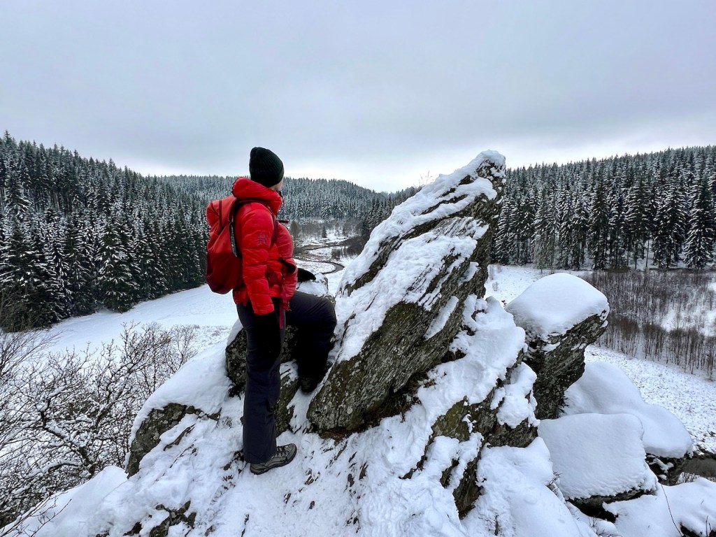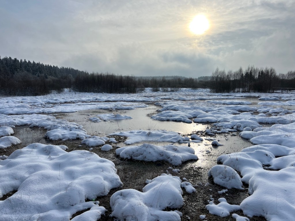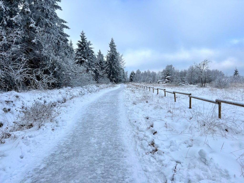 Wenn du aus dem Westen Deutschlands kommend mal so richtigen Winter erleben willst, bist du im Hohen Venn genau richtig. Mit einer Höhe zwischen 600-700 Metern kannst du sehr häufig mit Schnee und schönem Winterwetter rechnen. Der Naturpark ist zudem wunderbar mit dem Pkw zu erreichen. Es gibt auch Busverbindungen. Die Straßen sind geräumt. Dennoch solltest du es vermeiden, im Winter mit Sommer- oder Allwetterreifen ins Hohe Venn zu fahren. Vor allem auf dem Parkplatz Nahtsief mussten wir mehreren Autos vom glatten, festgefahrenen Schnee zurück auf die Straße helfen.