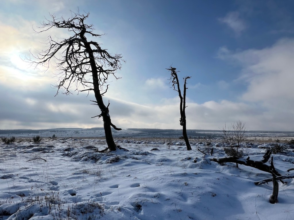 Wir folgen dem zum Teil etwas glatten Wanderweg, der nach etwa einem Kilometer auf verschneite Holzplanken übergeht, immer weiter geradeaus und lassen zwei Abzweige nach rechts verstreichen. Unser Ziel sind nämlich die verknöcherten Bäume Noir Flohay, die irgendwo linker Hand des Weges in der Ferne liegen. So richtig weiß ich nicht, wie wir die Bäume im tiefen Schnee erreichen können, doch nach etwa 2 Kilometern taucht plötzlich ein kleiner Steg auf, der nach links führt. Dahinter können wir Fußspuren im Schnee ausmachen. Sie verlaufen ungefähr in die richtige Richtung der bizarren Noir-Flohay-Bäume, und in der Tat erreichen wir diese dann tatsächlich nach 30-minütigem Schneegestapfe. Was für ein Anblick, was für ein grandioses Fotomotiv! Begeistert schwingen wir unsere Kameras, bevor wir wieder den Rückweg antreten.