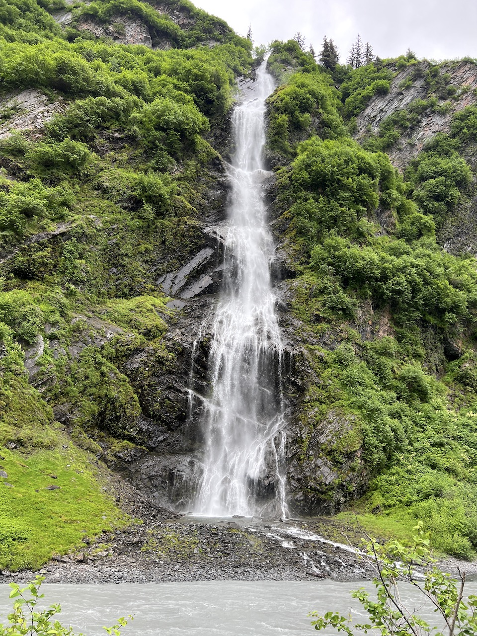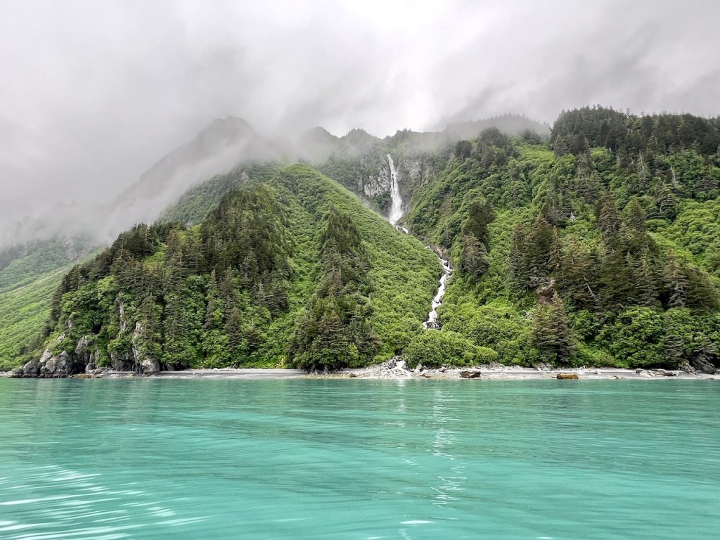 Gegen 16 Uhr machen wir uns mit dem Schiff zurück auf die etwa 2-stündige Rückfahrt von der Gletscherlagune nach Valdez. Unterwegs halten wir auf halber Strecke noch bei den Anderson Falls. Zugegeben, ich war bisher noch nicht auf Hawaii, aber ich kenne Fotos. Und hätte ich nicht gewusst, dass wir uns gerade in Alaska befinden, landschaftlich sieht diese Gegend einigen Ecken von Hawaii doch zum Verwechseln ähnlich. Diese unwirklichen Farben, das türkisfarbene Meerwasser, die grün bewaldeten Berge und die Wasserfälle. Wieder sind wir absolut begeistert und kommen gegen 18 Uhr sehr müde, aber überglücklich zurück im Hafen von Valdez an.