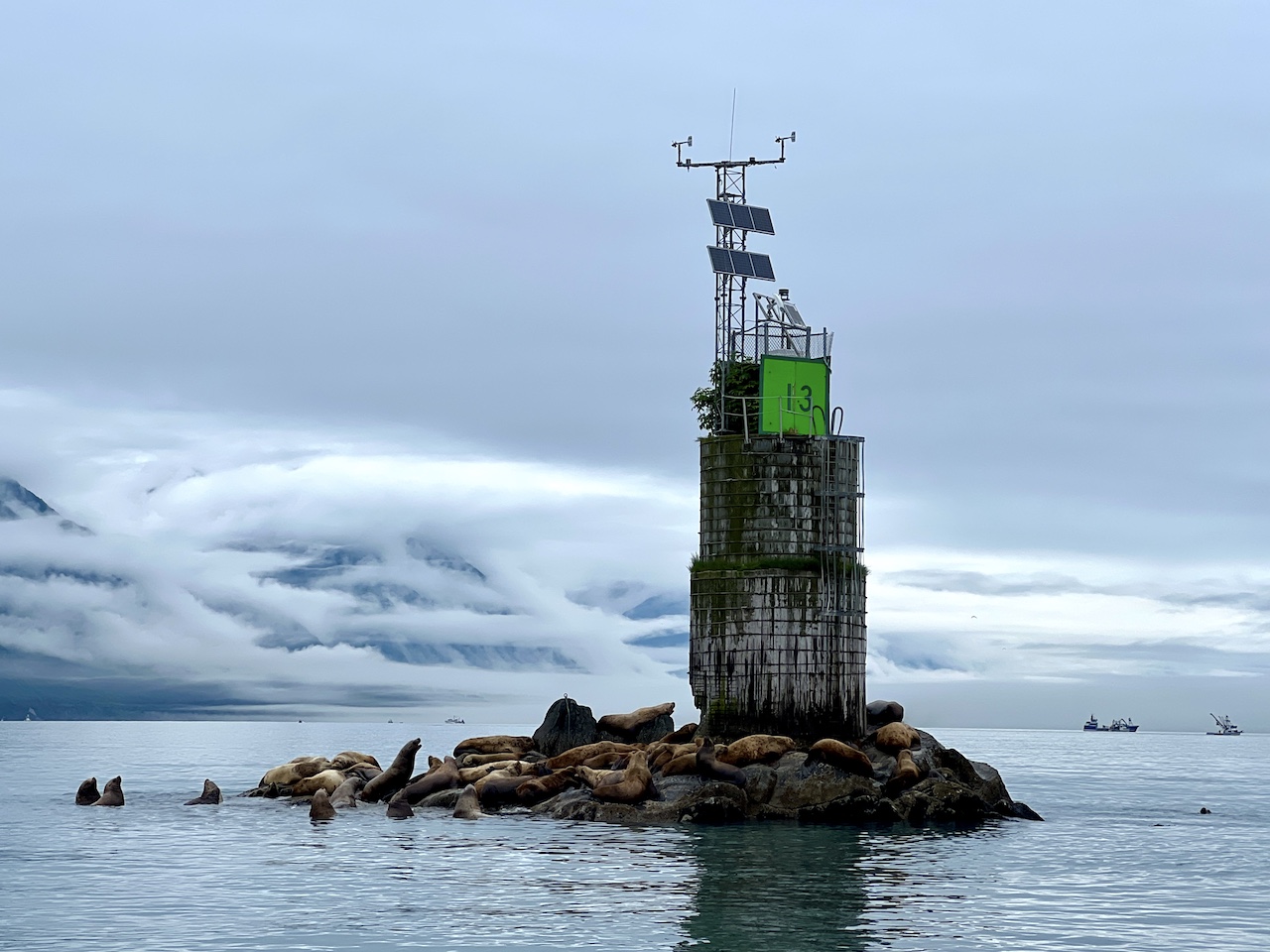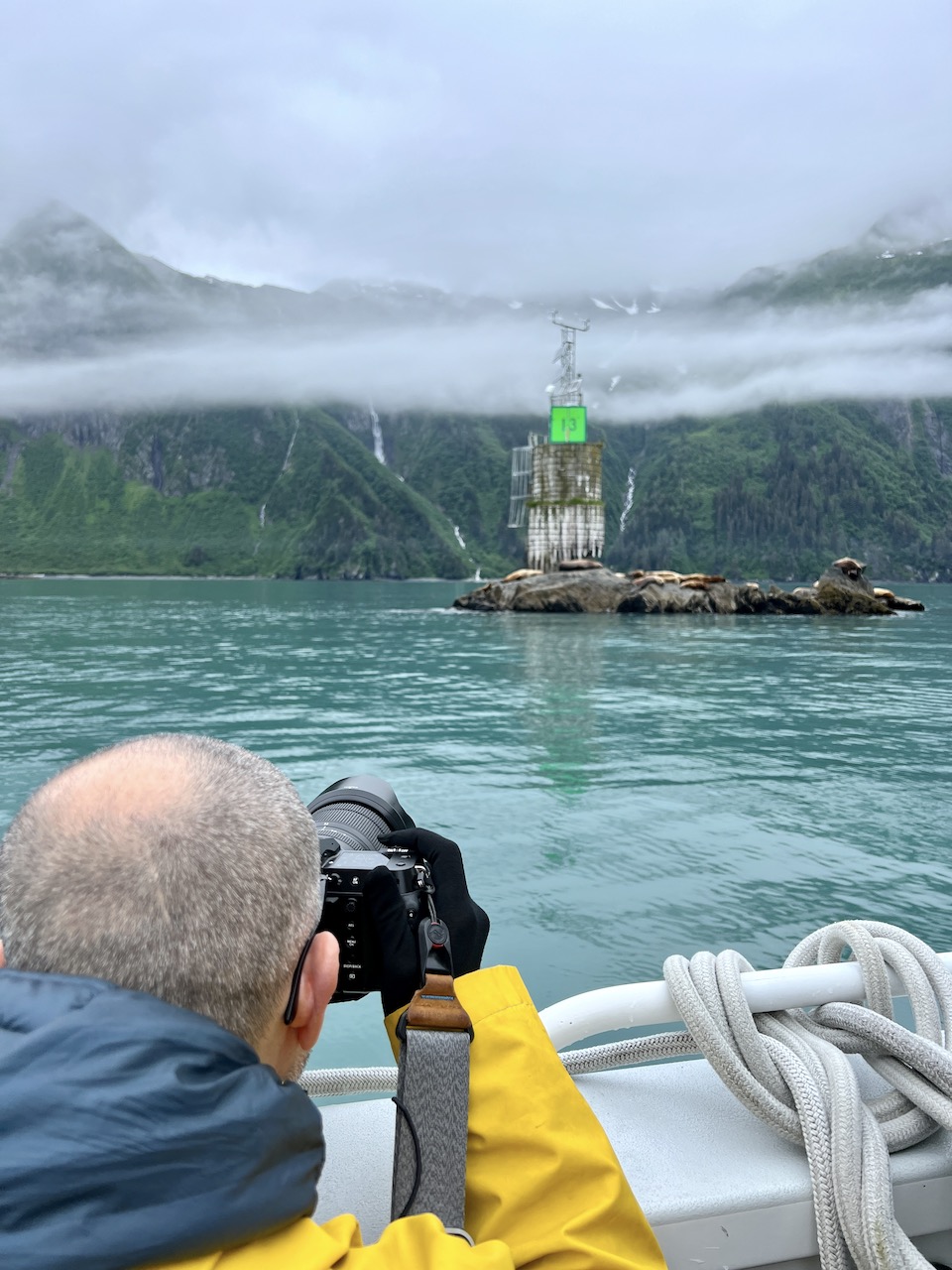 Da der Ort Valdez an sich nicht besonders viel zu bieten hat, unternehmen wir am zweiten Tag unseres Aufenthalts einen ganztägigen Ausflug mit Pangaea Adventures hinaus auf den Prince William Sound. Mit einem relativ kleinen Schiff geht’s in einer Gruppe von etwa 20 Leuten los Richtung Columbia Glacier. Unterwegs treffen wir nicht nur auf eine große Gruppe von Seehunden, die es sich auf einem Felsen im Wasser gemütlich gemacht haben, sowie auf dem Rücken schwimmende Otter, sondern auch, je näher wir dem Gletscher kommen, viele kleinere und größere im Wasser treibende Eisberge. Dick eingepackt bibbern wir, Daniel und ich, zum Fotografieren und Filmen auf dem kleinen Vordeck im eisigen Fahrtwind. Das Wetter klart nach und nach auf, und wir können uns gar nicht satt sehen an der Wahnsinns-Kulisse, die uns umgibt.