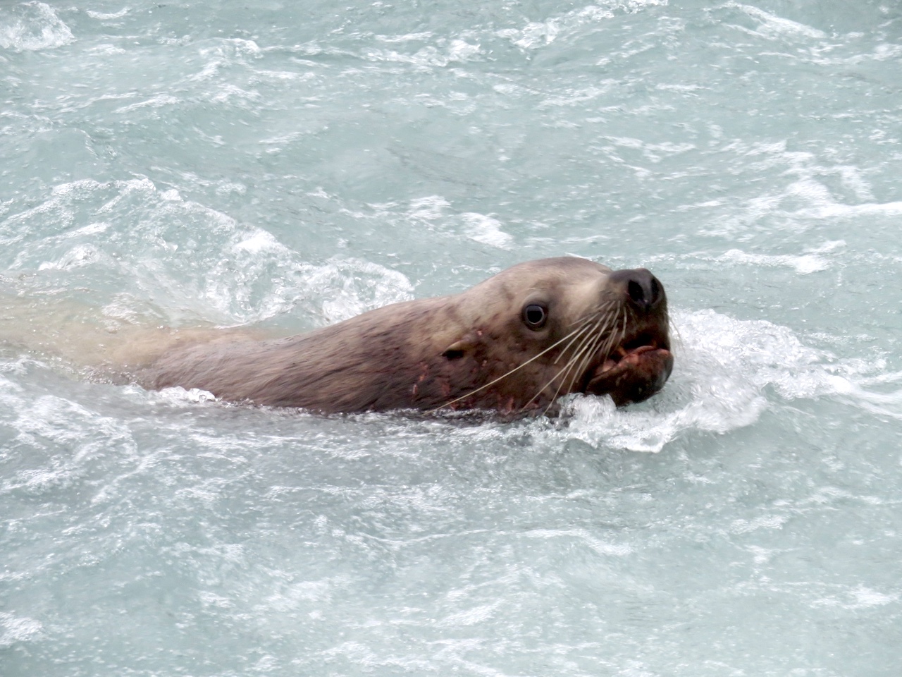 Bevor wir am dritten Tag Valdez wieder verlassen, fahren wir noch zu einem Ort, von dem wir gehört haben, dass man hier mit ziemlich großer Sicherheit Bären, aber auch viele andere Wildtiere wie Seeadler, Seelöwen und Otter beobachten kann. Die Solomon Gulch Hatchery ist eine Lachszucht, ausgestattet mit einer Fischleiter, über die sich die zum Laichen zurückkehrenden Lachse vor allem in den Monaten Juli bis Oktober in Massen stauen. Ein Festmahl für oben genannte Wildtiere. Wir beobachten zwar auch hier keinen Bären, aber einige hungrige Seelöwen und Otter, insgesamt ein sehr sehenswertes Spektakel.