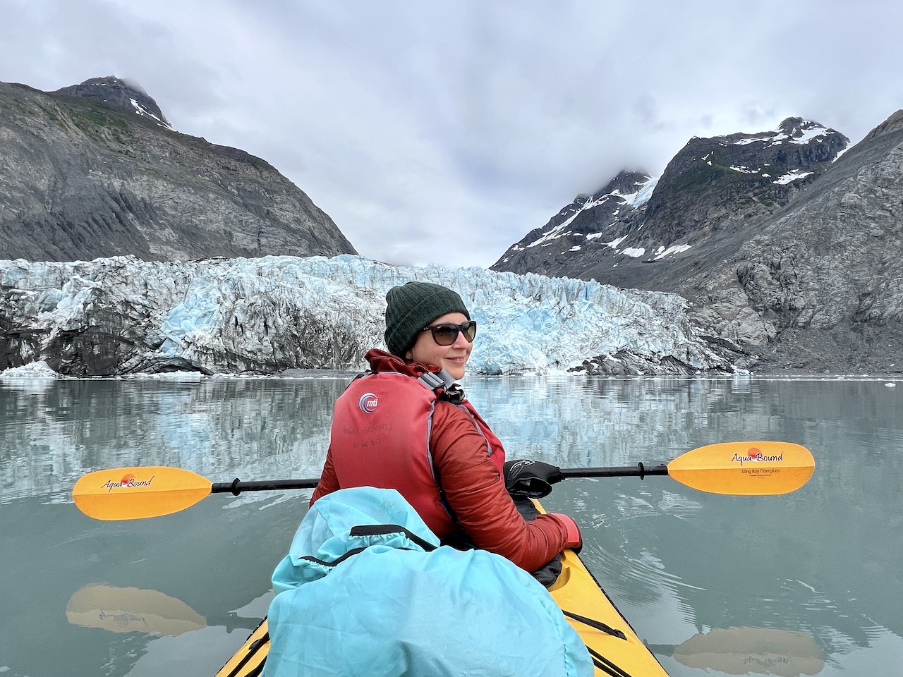 Die Gruppe wird in 3 Kleingruppen unterteilt, die, jede mit eigenem Guide, auf unterschiedlichen Wegen Richtung Gletscher paddeln werden. Wir bekommen eine kurze Einführung von unserem Guide Baird, dann besteigen wir die Kajaks und schon geht’s los ans gegenüberliegende Ufer zum ersten Gletscherarm. Wir treiben ruhig über das milchig grüne, spiegelglatte Wasser dem Eis entgegen, und je näher wir diesem gigantischen Überrest der letzten Eiszeit kommen, desto lauter hören wir das Arbeiten und Schieben des sich ständig neu ineinander verkantenden Eises. Es knackt und kracht aus dem Inneren des 48 Kilometer langen Gletschers, was für eine eindrückliche Kraft! Von Baird erfahren wir, dass sich der Columbia Glacier jeden Tag um etwa 2 Meter nach vorne bewegt und damit einer der am schnellsten fließenden Gletscher Nordamerikas ist.