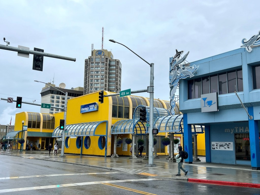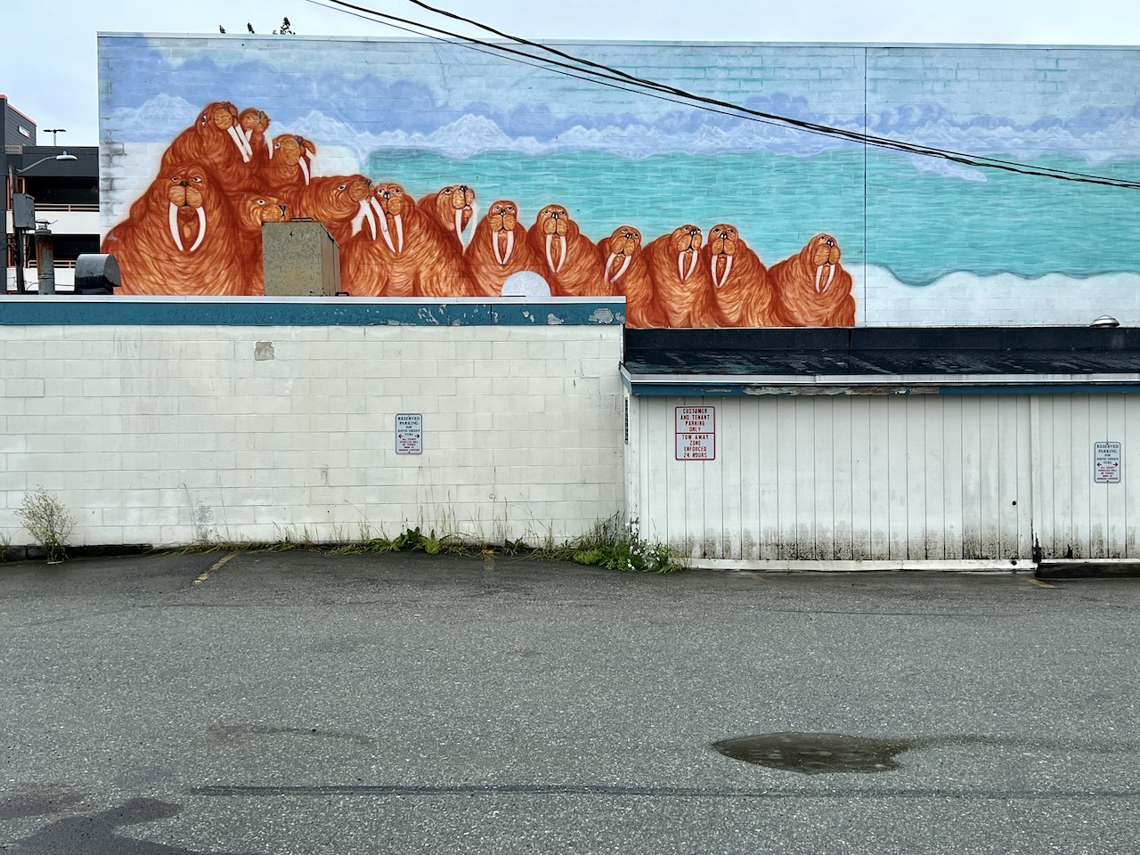 Als es draußen wieder etwas aufklart, laufen wir weiter durch Downtown. Uns waren schon auf der Fahrt in die Stadt einige riesige, kreative, bunte Street-Art-Murals an vielen Fassaden entlang der 4th and 5th Avenue und in entsprechenden Querstraßen aufgefallen, die wir nun nach und nach ablaufen und fotografieren. Die Szenen stammen alle irgendwie aus der Geschichte und Kultur Alaskas. Da ist zum Beispiel die riesige Wyland-Whaling-Wall mit schwimmenden Grönland- und Beluga-Walen und anderen Meerestieren, gestaltet vom bekannten Mural-Künstler Robert Wyland. Oder auch Szenen aus dem Leben der Indigenen Alaskas sowie Landschaften und Portraits. Die meisten Murals sind von Künstlern aus Anchorage gestaltet, die in das Leben der insgesamt recht tristen, grauen Stadt ein bisschen Farbe bringen wollten.