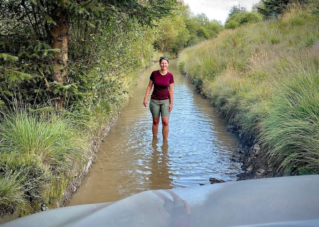 Nach etwa 1,5 Kilometern stehen bereits die ersten Wasserdurchfahrten durch braunes, schlammiges, stehendes Gewässer an. Alles überhaupt kein Problem für unser Fahrzeug. Die riesigen Pfützen sind meistens nicht tiefer als 40-50 Zentimeter. Und wir haben großen Spaß beim Durchfahren. Doch dann folgt ein Gewässer, dessen Ausmaße wir aus dem Fahrzeug nicht mehr abschätzen können, auch weil es in einer Kurve liegt, die wir nicht einsehen können. Zum Glück trage ich eine kurze Hose und Crocs und wate das braune Nass zunächst zu Fuß ab, um dann Entwarnung geben zu können. Kein Problem für Samu!