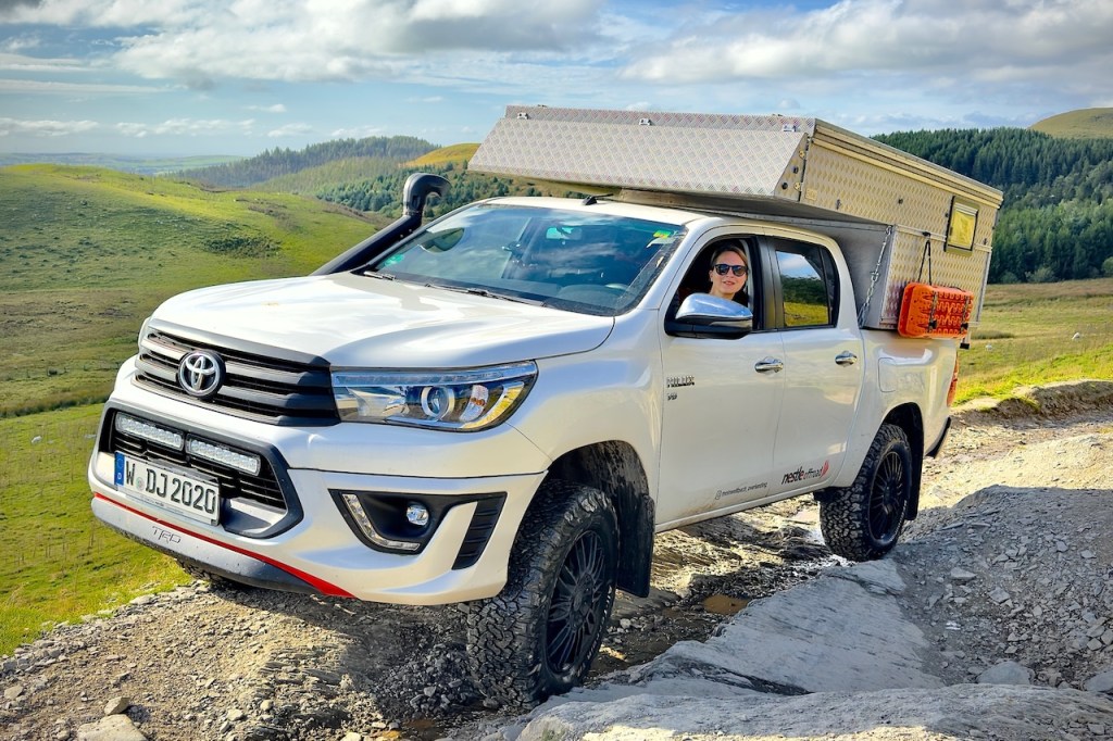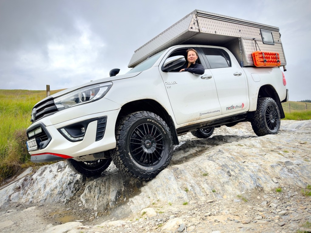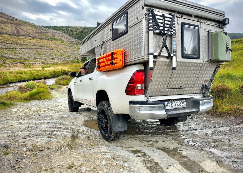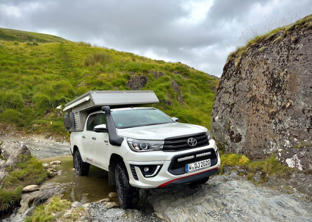 → Fahrzeug? Für diese Tour ist ein geländegängiges Allrad-Fahrzeug mit guten AT-Reifen, genug Bodenhöhe, Böschungswinkel und Wattiefe unbedingt nötig! Wir fahren einen höher gelegten Toyota Hilux, welcher von der Länge (5,40m) und Breite (1,85m) her wohl das absolut Maximale für diese Route darstellt. Wir sind überall gut durchgekommen und hatten keinerlei Probleme mit der Größe/Höhe (2,30m) des Fahrzeugs. Noch größeren Offroad-Reisemobilen empfehlen wir die Strecke jedoch nicht.