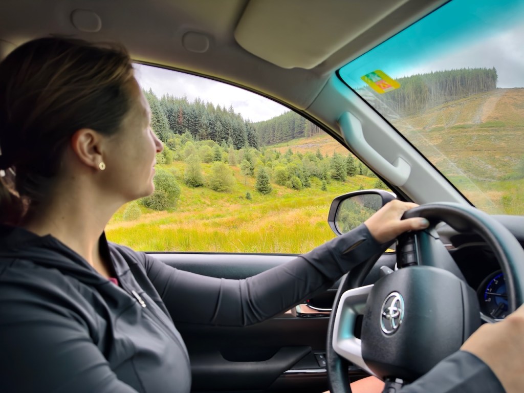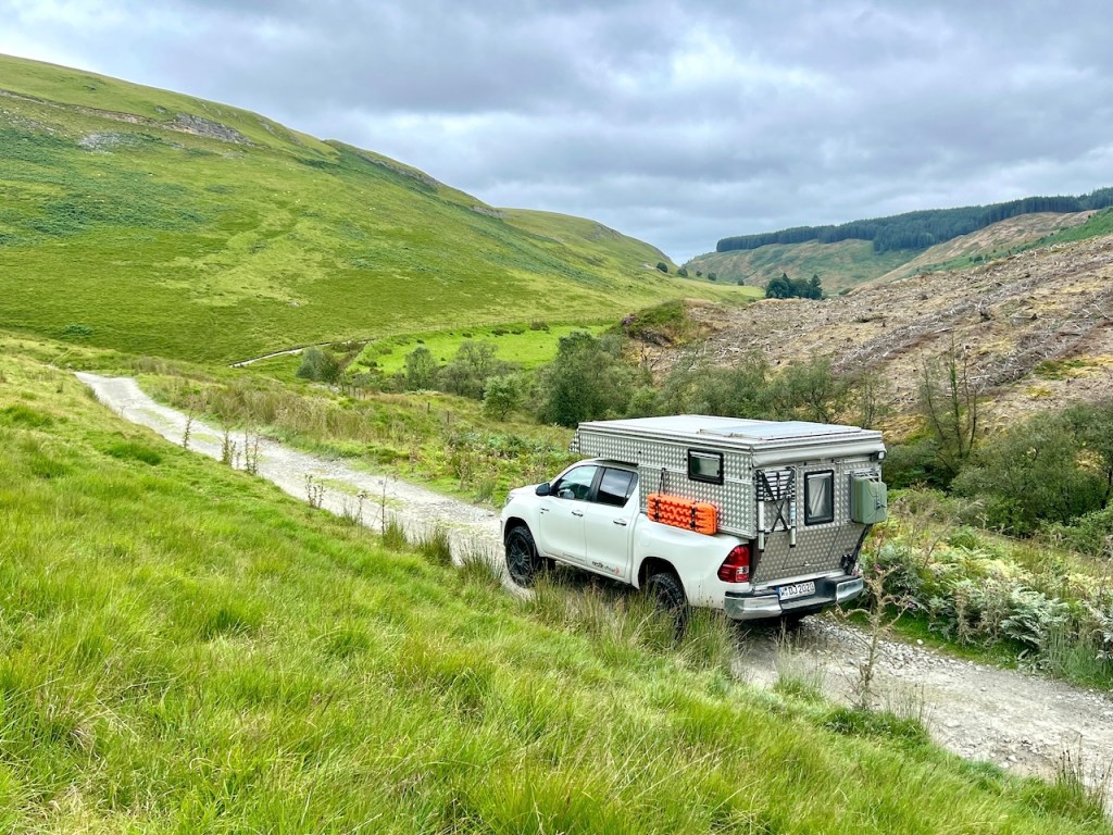 Nach etwa fünf Kilometern lichtet sich der Wald, und wir erreichen den höher gelegenen, waldfreien Streckenabschnitt der Strata Florida mit wunderbarer Aussicht auf die umliegenden grün geschwungenen Grampian Mountains. Doch viel Zeit zum Genießen bleibt nicht, denn die Strecke bleibt extrem anspruchsvoll durch viele gefährlich spitze Felsblöcke. Inzwischen sitze ich wieder am Steuer und Daniel weist mir von draußen bei besonders steilen Abschnitten die beste Fahrlinie. Diese Arbeitsteilung funktioniert bei uns seit vielen Jahren sehr gut beim Offroad Fahren.