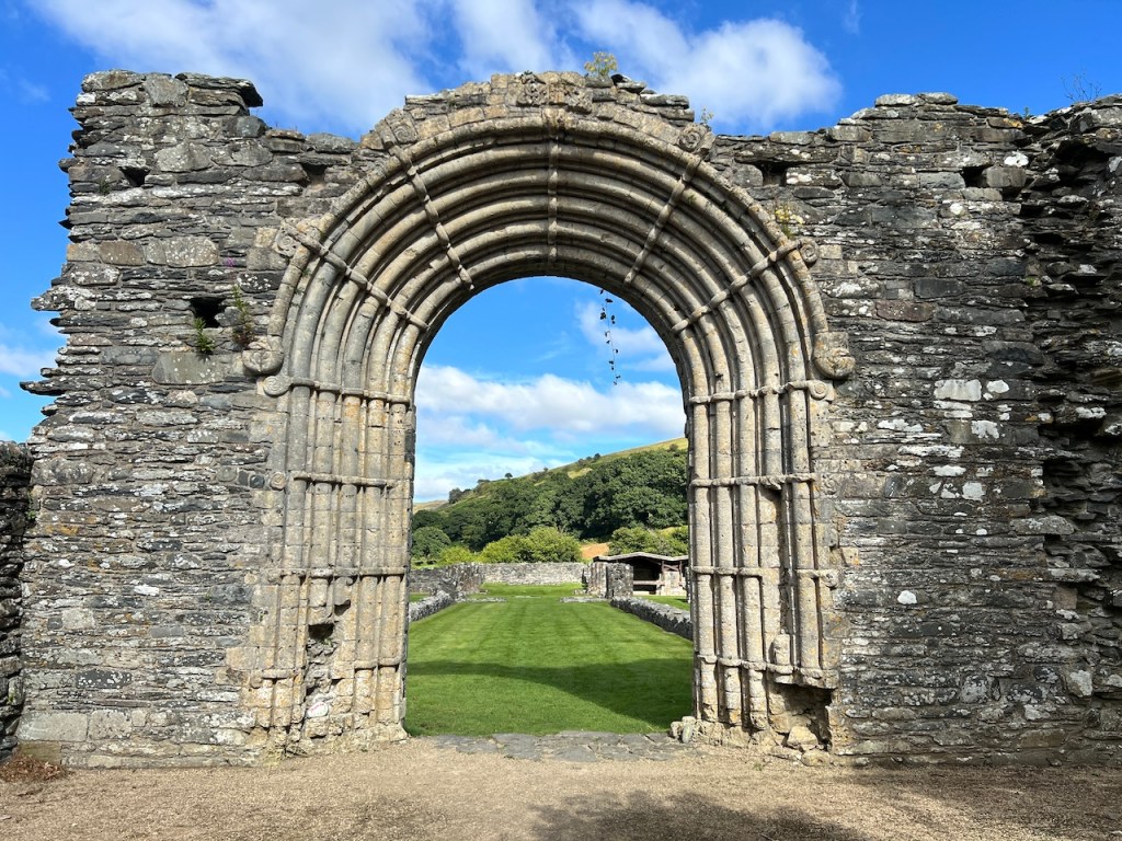 Wir erreichen die Strata Florida Abbey an einem sonnigen August-Nachmittag gegen 16 Uhr. Das Wetter spielt also schon einmal mit! Bevor wir weiterfahren, um in den Trail einzusteigen, werfen wir einen kurzen Blick auf das Gelände des Klosters. Es wurde von 1184-1225 erbaut, heute sind von der kreuzförmigen Kirche mit rechteckigem Chorabschluss und drei Nebengebäuden nur noch einige (niedrige) Mauern sowie Torbögen erhalten. Ich schieße ein paar Fotos, und dann geht es auch schon weiter. Unser Plan ist es, etwa die Hälfte der 15 Offroad-Kilometer noch am heutigen Tag zu meistern, dann unterwegs irgendwo zu übernachten, und die zweite Hälfte der Strata Florida am kommenden Tag zurückzulegen.