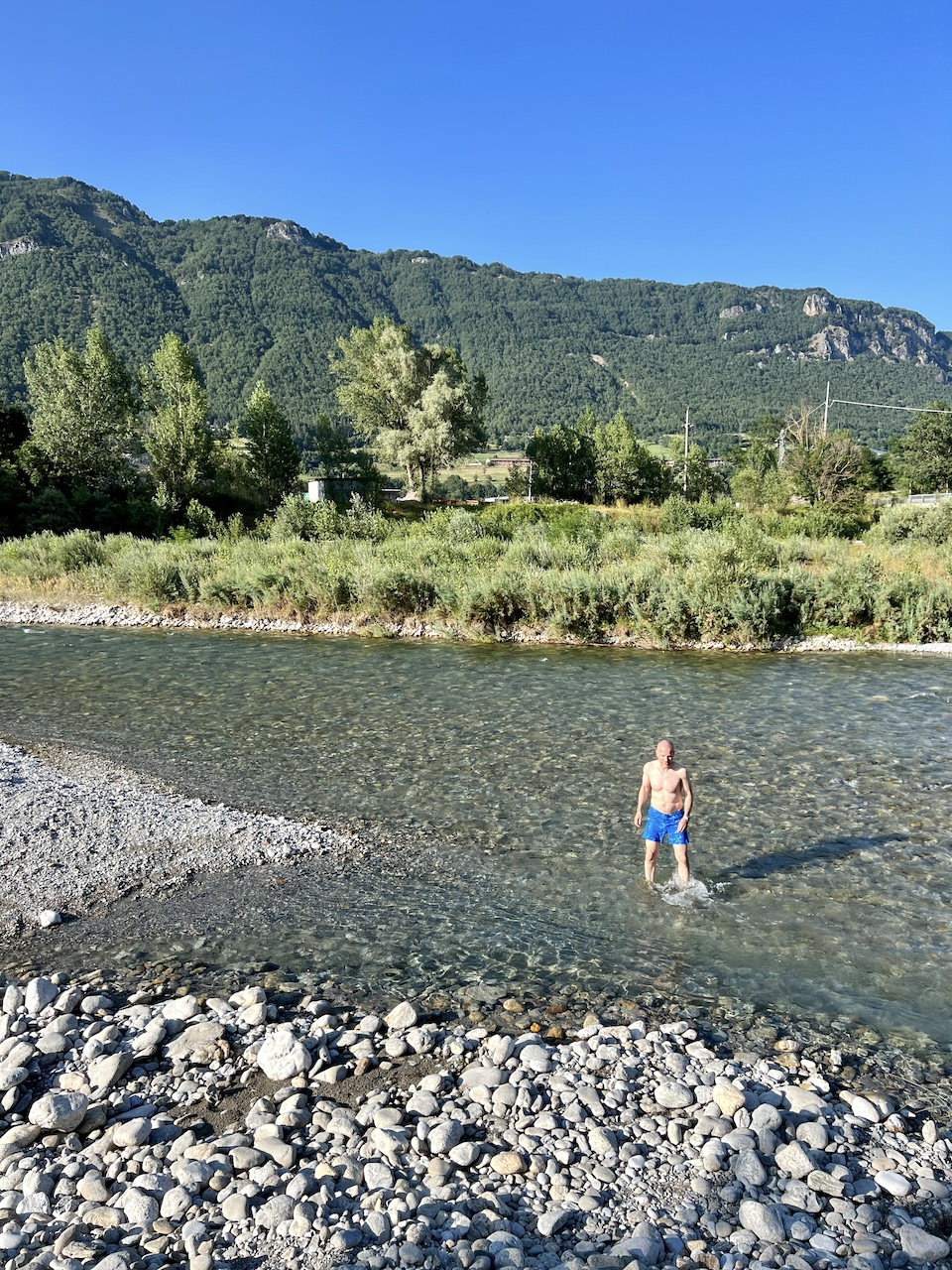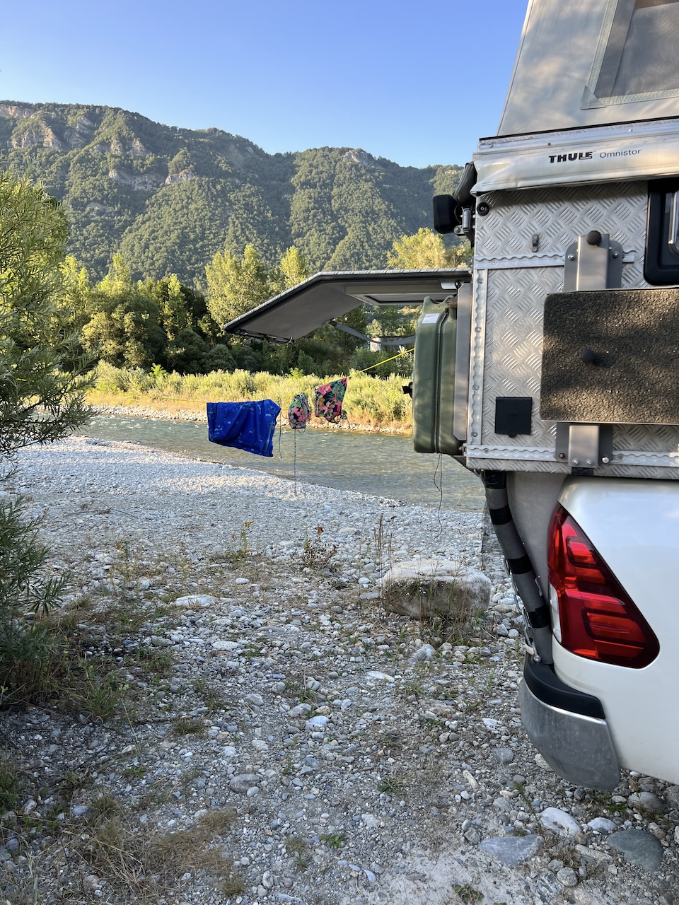 Auf der anderen Seite des Bergpasses, auf der italienischen Seite der Alpen, erwartet uns schönstes Sommerwetter. Wir fahren noch bis zum Örtchen Demonte und bauen dort in einem steinigen Flussbett, geschützt hinter einigen Sträuchern, in der Nähe der Brücke Ponte di Festiona unser Camp auf. Zunächst kühlen wir uns im eiskalten Fluss ab, bevor wir den lauen Sommerabend vor dem Camper „landesgemäß“ bei Pasta und Rotwein ausklingen lassen. Am Folgetag sollen unsere ersten richtigen Offroad-Touren beginnen.