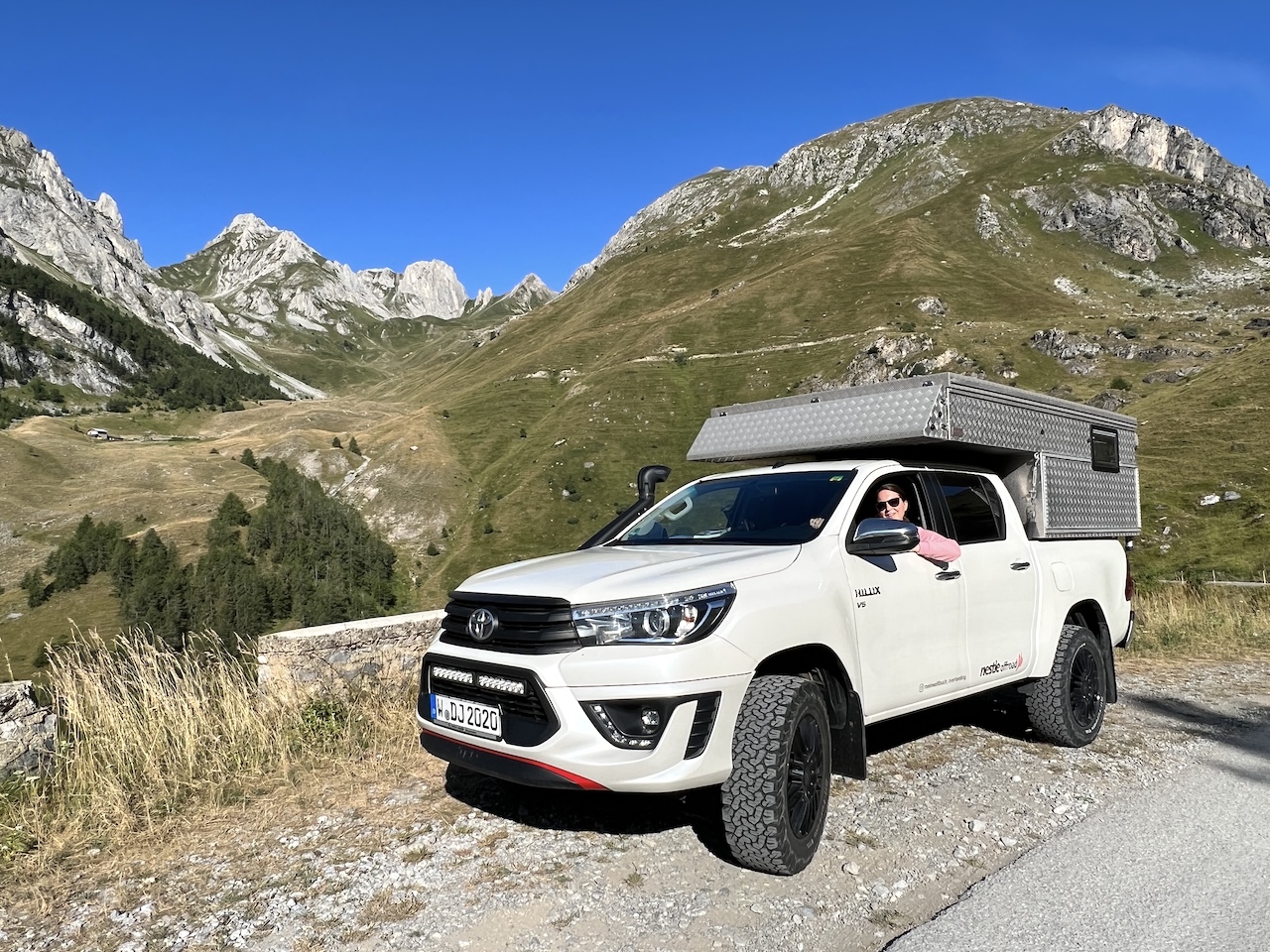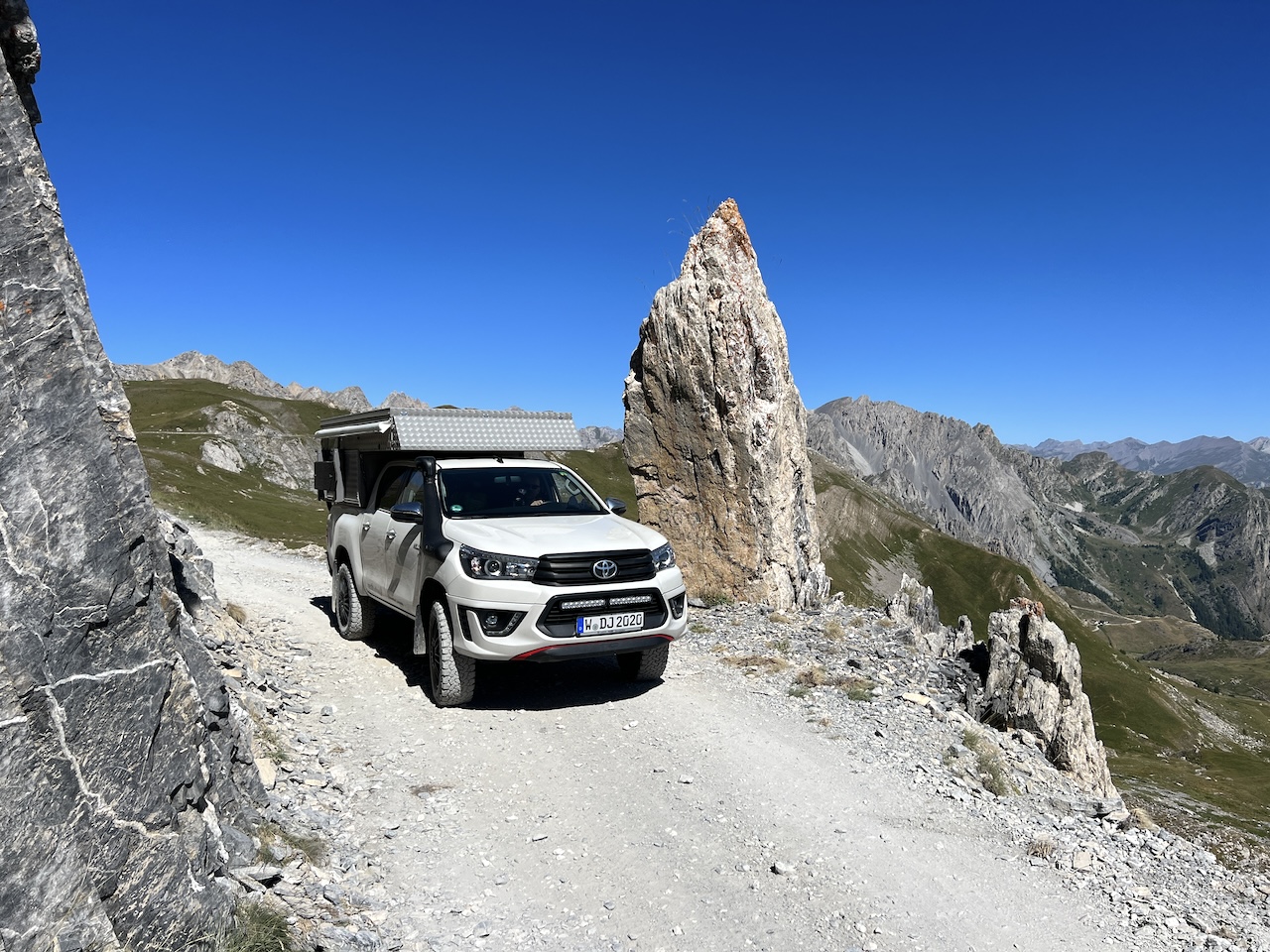 Zurück am Fahrzeug geht es weiter über besagte einspurige Piste, die schon bald immer exponierter am Hang und an einzelnen Felsen entlang führt. Zum Glück begegnen uns nur zwei andere Fahrzeuge, denen wir in den Kehren mit etwas Rangiererei gut ausweichen können. Nach weiteren Offroad-Kilometern gibt es einen Abzweig nach rechts zum Col Preit, dem wir folgen. Vorbei an den Hütten des Agriturismo La Meja kommen wir ins kleine Örtchen Preit und fahren weiter bis nach Marmora. Gegen 17Uhr erreichen wir den sehr empfehlenswerten Campingplatz Lou Dahu, der von Sandra und Roland, zwei Weltenbummlern aus Deutschland, betrieben wird. Nach einem hervorragenden Abendessen, welches die beiden mit lokalen Produkten zaubern, drehen wir noch eine Spazierrunde durch das hübsche Dorf Marmora. Nur wenige andere Overlander, Mountainbiker oder Wanderer kommen im Sommer hierher, es herrscht absolute Ruhe und wir genießen das sehr.