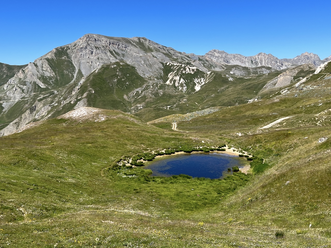 Danach lassen wir die Ruinen der Kaserne linker Hand liegen und folgen der Piste weiter. Ein paar Kilometer später parken wir den Wagen am Pistenrand und unternehmen eine kurze Wanderung zum türkis-grün schimmernden Lago della Meja. Wir können uns kaum satt sehen an der grandiosen Bergwelt, die uns umgibt.