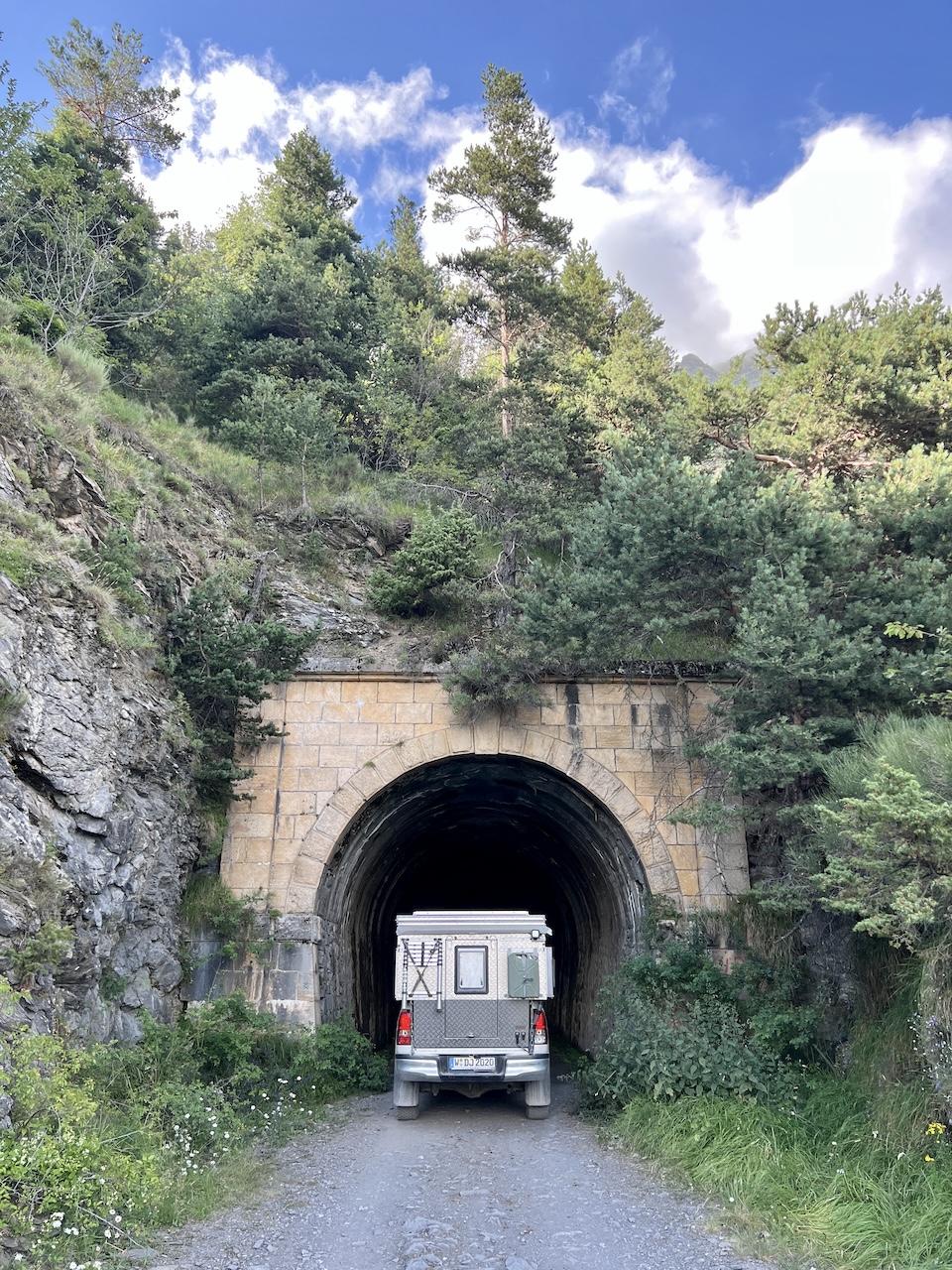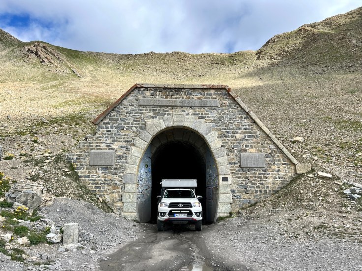 Am kommenden Vormittag fahren wir über befestigte Straßen zurück nach Demonte und weiter über die französische Grenze nach La Condamine-Chaterlard. Die nächste Offroad-Tour soll uns durch einen auf 2637 Metern Höhe liegenden, 520 Metern langen, dunklen ehemaligen Militärtunnel über den Col du Parpaillon bringen. Dieser Klassiker unter den unbefestigten, hochalpinen Gebirgspässen in den Westalpen verbindet das Tal der Ubaye im Département Alpes-de-Haute-Provence mit der Gemeinde Crévoux im Département Hautes-Alpes. Die eigentliche Passhöhe befindet sich auf 2780 Metern. Diese kann jedoch nicht angefahren werden, da unter dem Passscheitel der besagte Tunnel du Parpaillon die Südostrampe mit der Nordwestrampe verbindet.