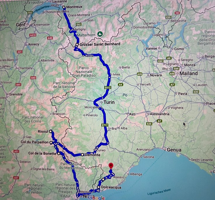 → Route? Wuppertal – Montreux (CH) – Großer Sankt Bernhard – Demonte (I) – Maira-Stura-Grenzkammstraße – Col du Parpaillon (FR) – Col de Valbelle – Eygliers – Val d´Oronaye – Col de la Bonette – Dolceaqua (I) – Ligurische Grenzkammstraße – Wuppertal